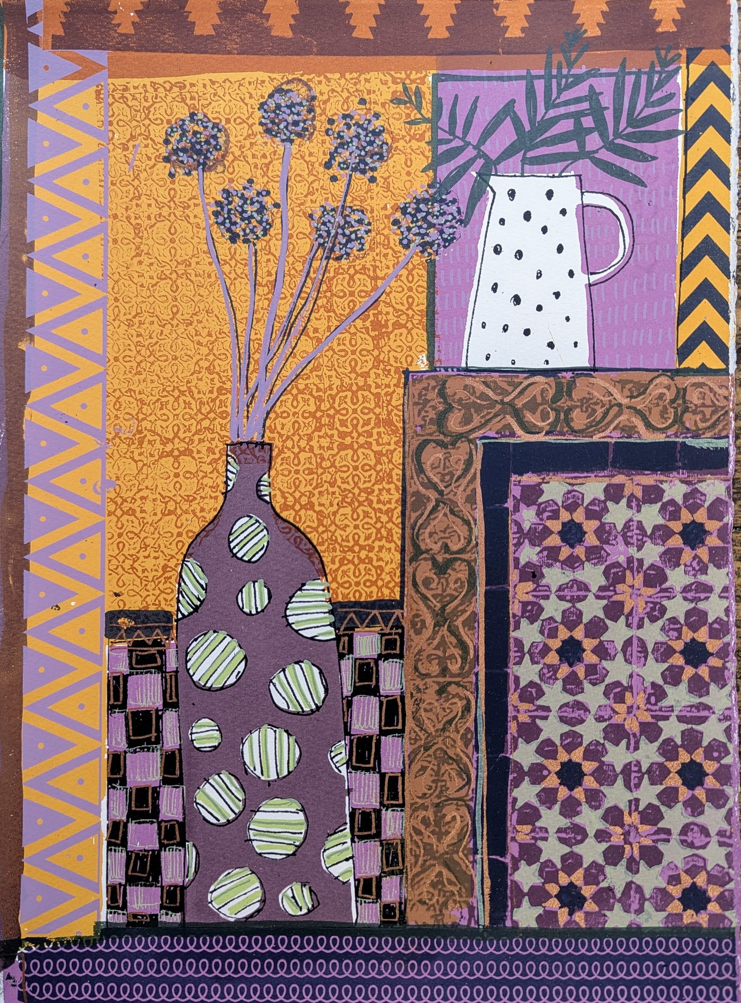 One of my most recent prints, where I am playing with layering pattern and colour, with still life and objects.